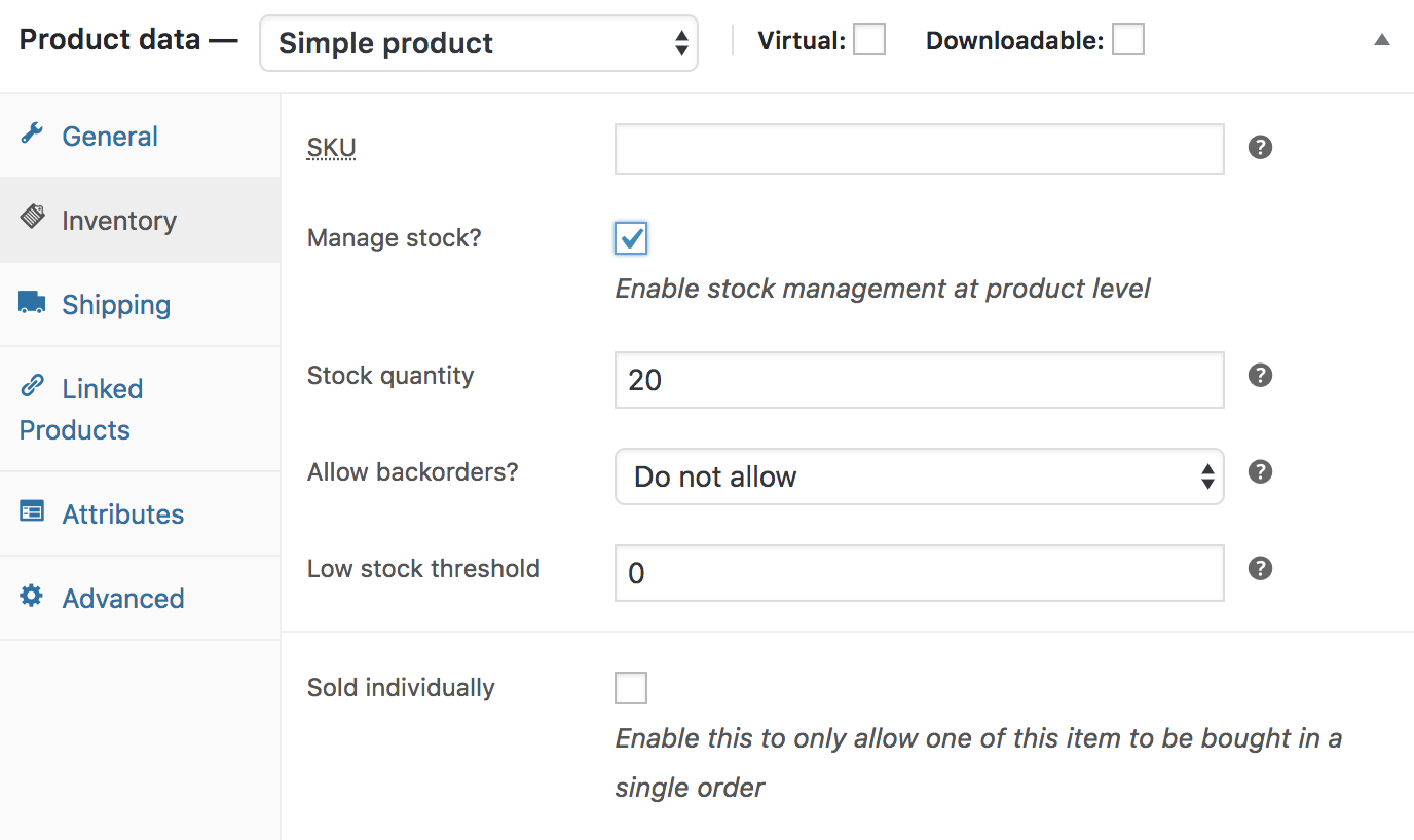- Tick the Sold Individually box to limit the product to one per order.
