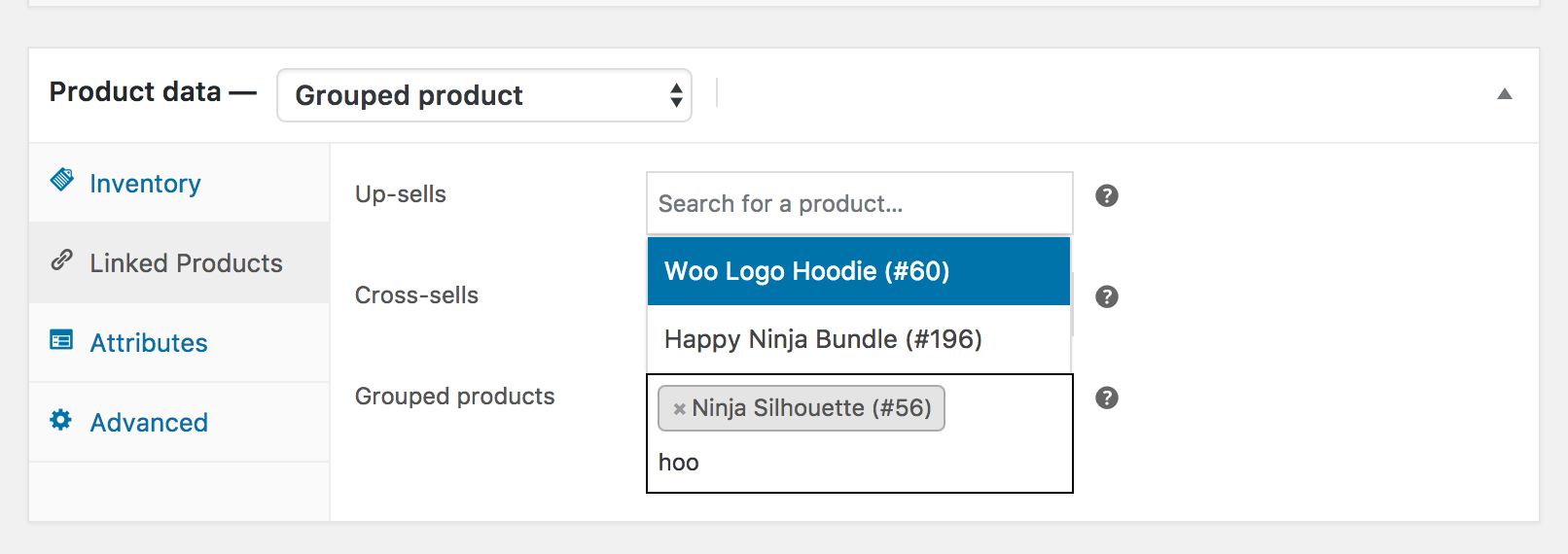 Using up-sells and cross-sells, you can cross promote your products. They can be added by searching for a particular product and selecting the product from the dropdown list: