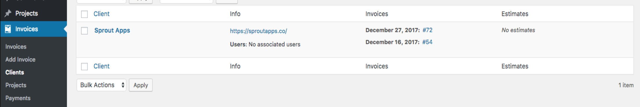 All invoices and estimates associated with the client are shown below the associated users option. This provides a quick way to view the record you need to see.