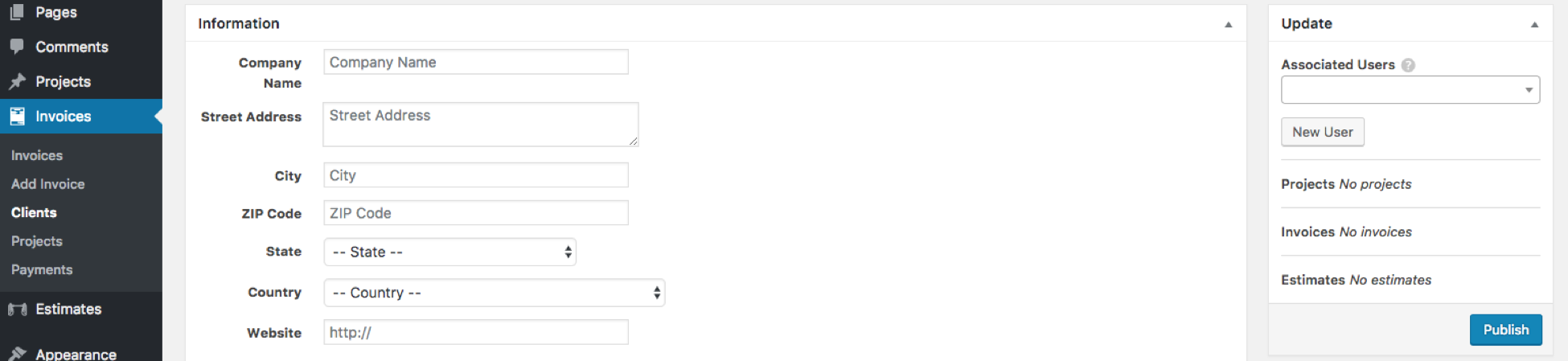 When clients are created using “Add Client” on the client tab, a WordPress user is created and associated with the new information. Clients are not limited to a single user; not limiting a client to a single user allows for you to have multiple points of contact at/for a company/client. The recipients for sending estimate and invoice notifications are these associated users.