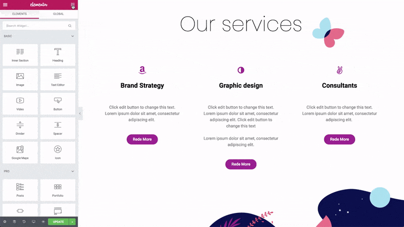 - Space Between – Widgets start and end at the edge of the column, with equal space between them
