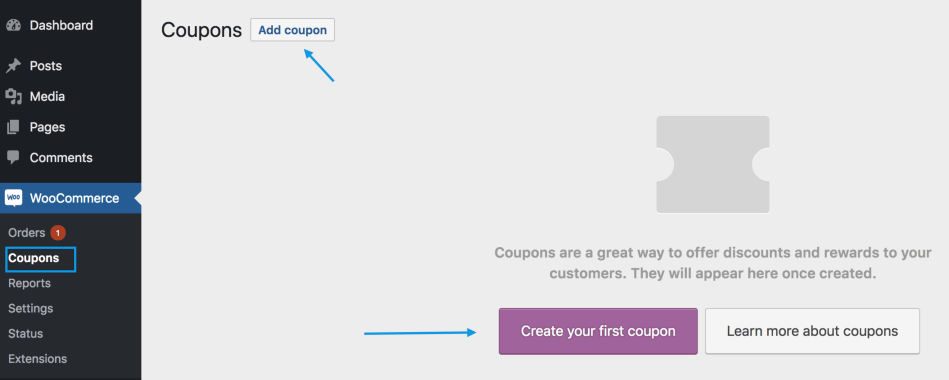 - A fresh installation of WooCommerce will show you an initial screen to create a coupon or to learn more.