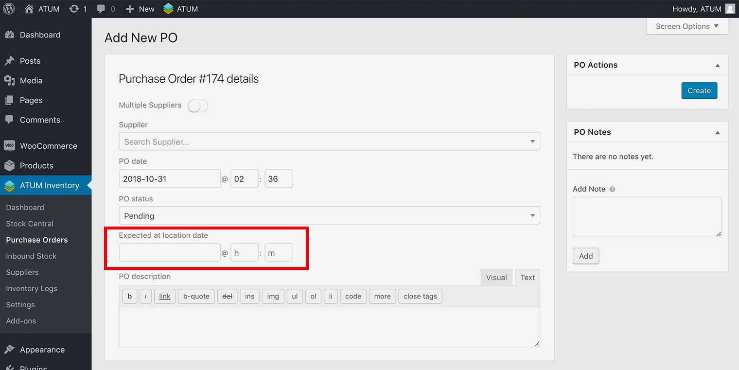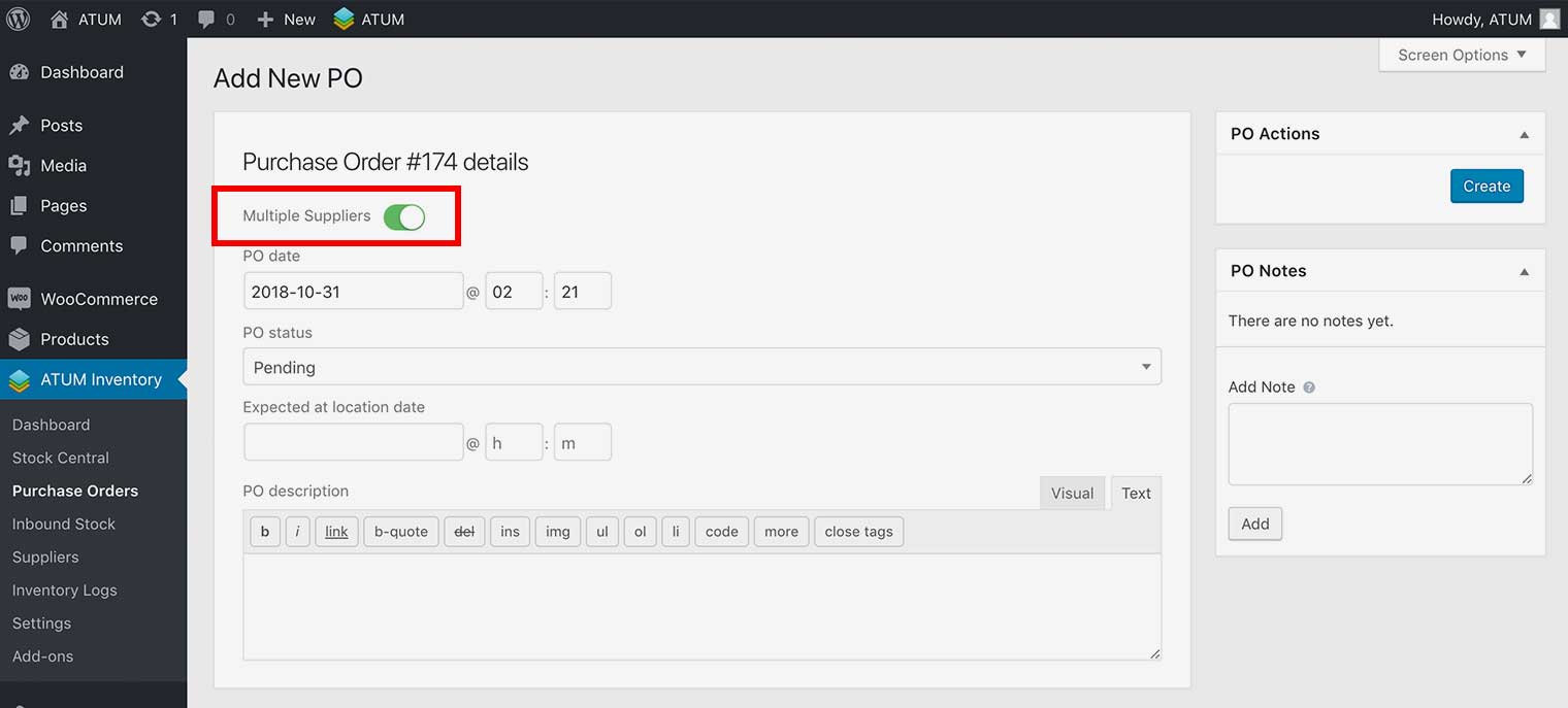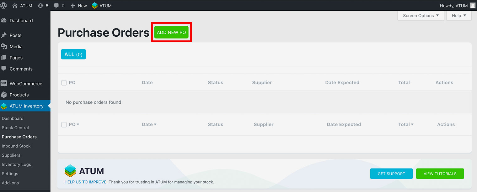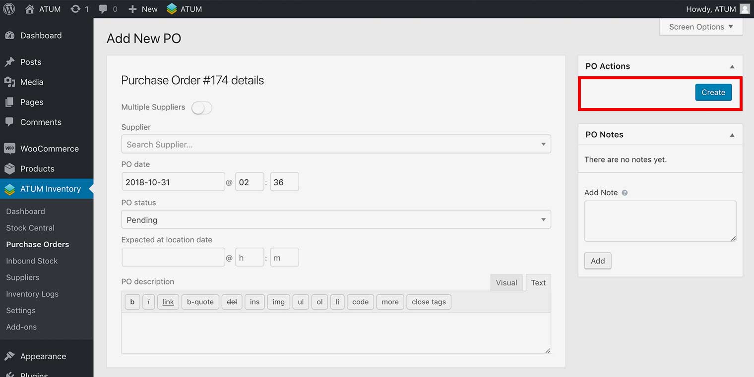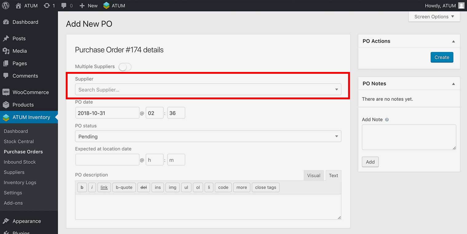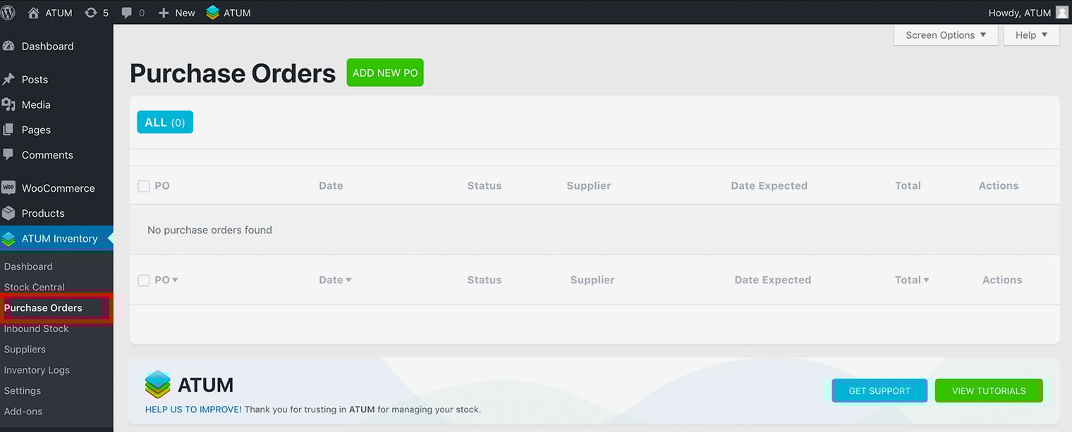 After you have set up products in WordPress, you can add purchase orders in ATUM when you purchase products from a supplier.