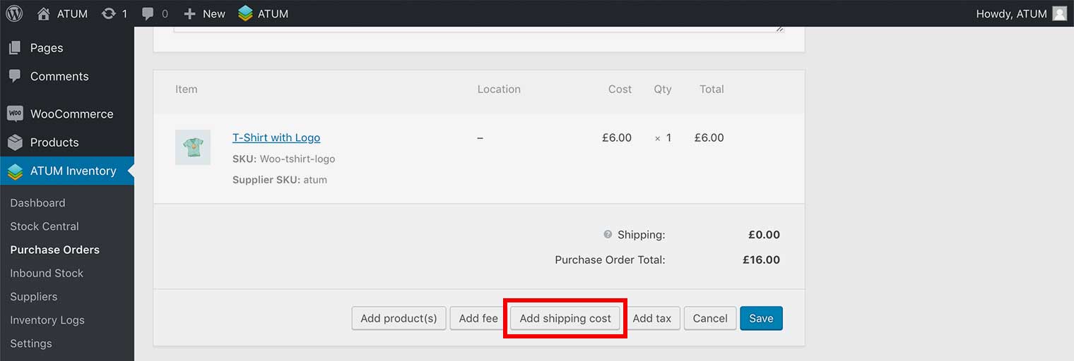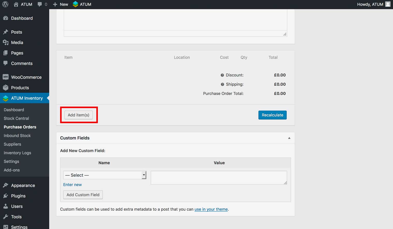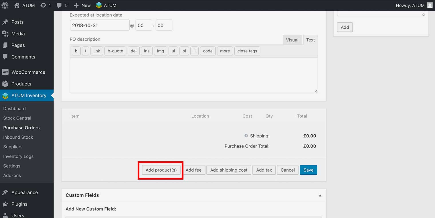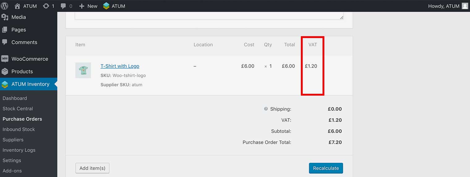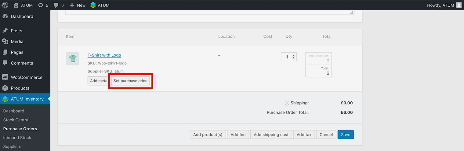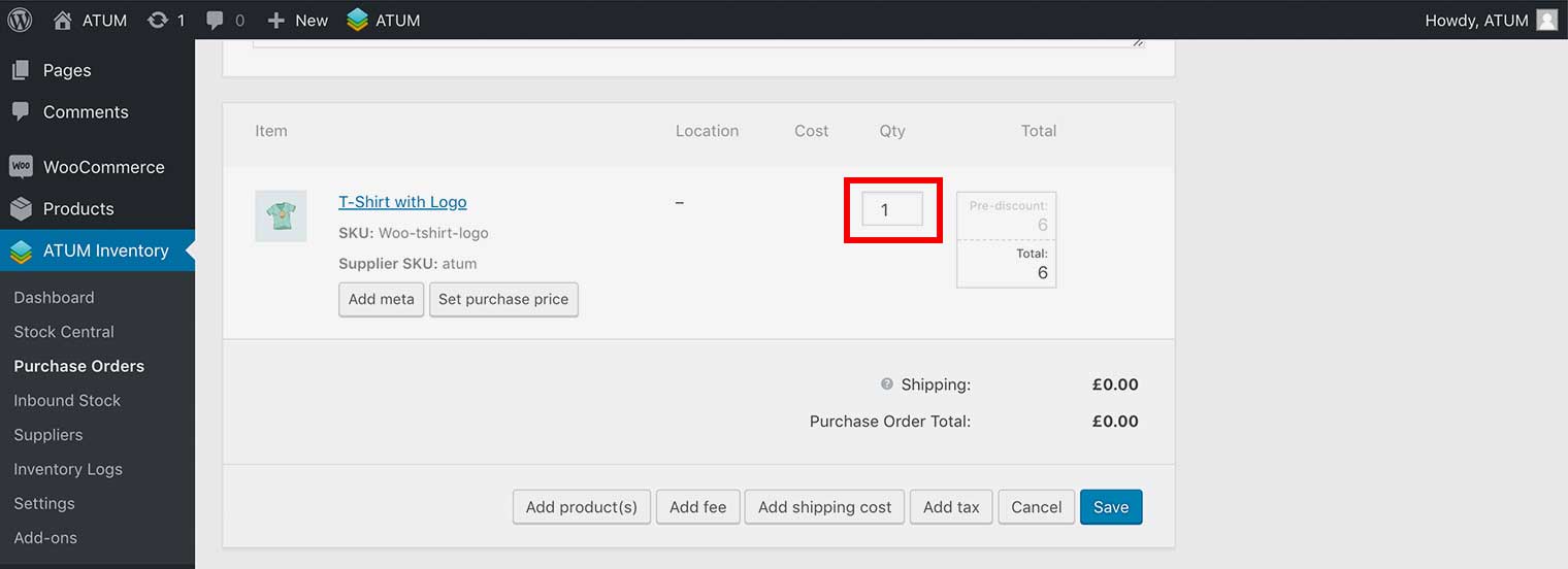 After you have set up products in WordPress, you can add purchase orders in ATUM when you purchase products from a supplier.