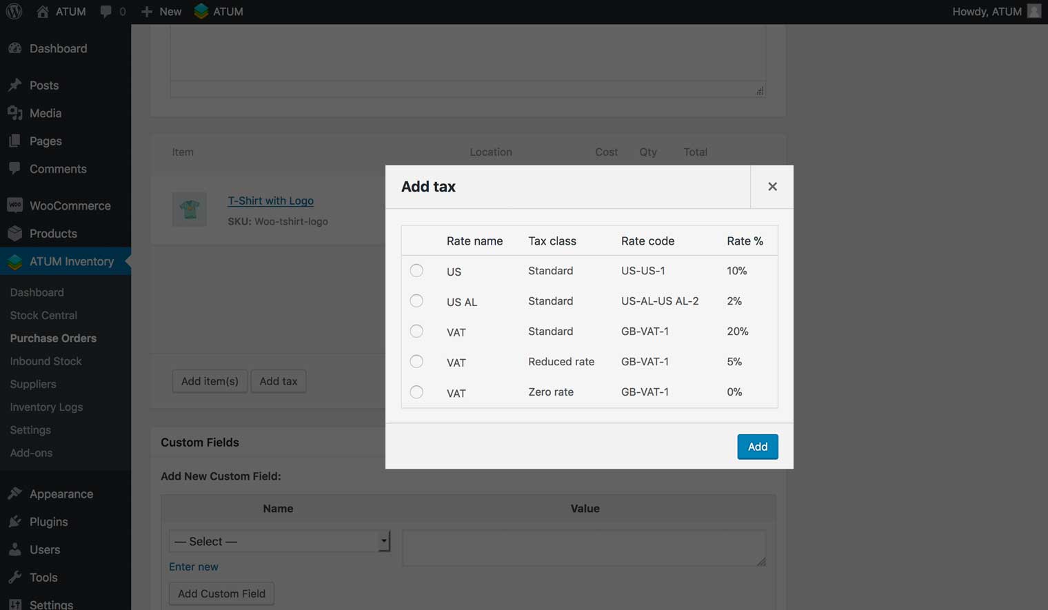 - The Add tax pop-up appears. Select the tax rate, and then click Add.