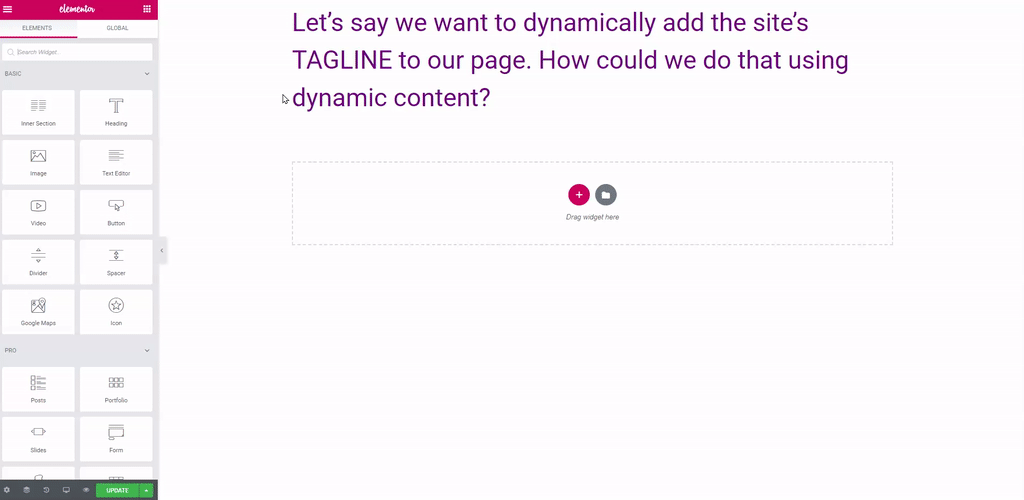 The Post Title Widget is a good example. This widget displays the title of a Page or Post. It’s dynamic because it changes according to the Page or Post it‘s used on.