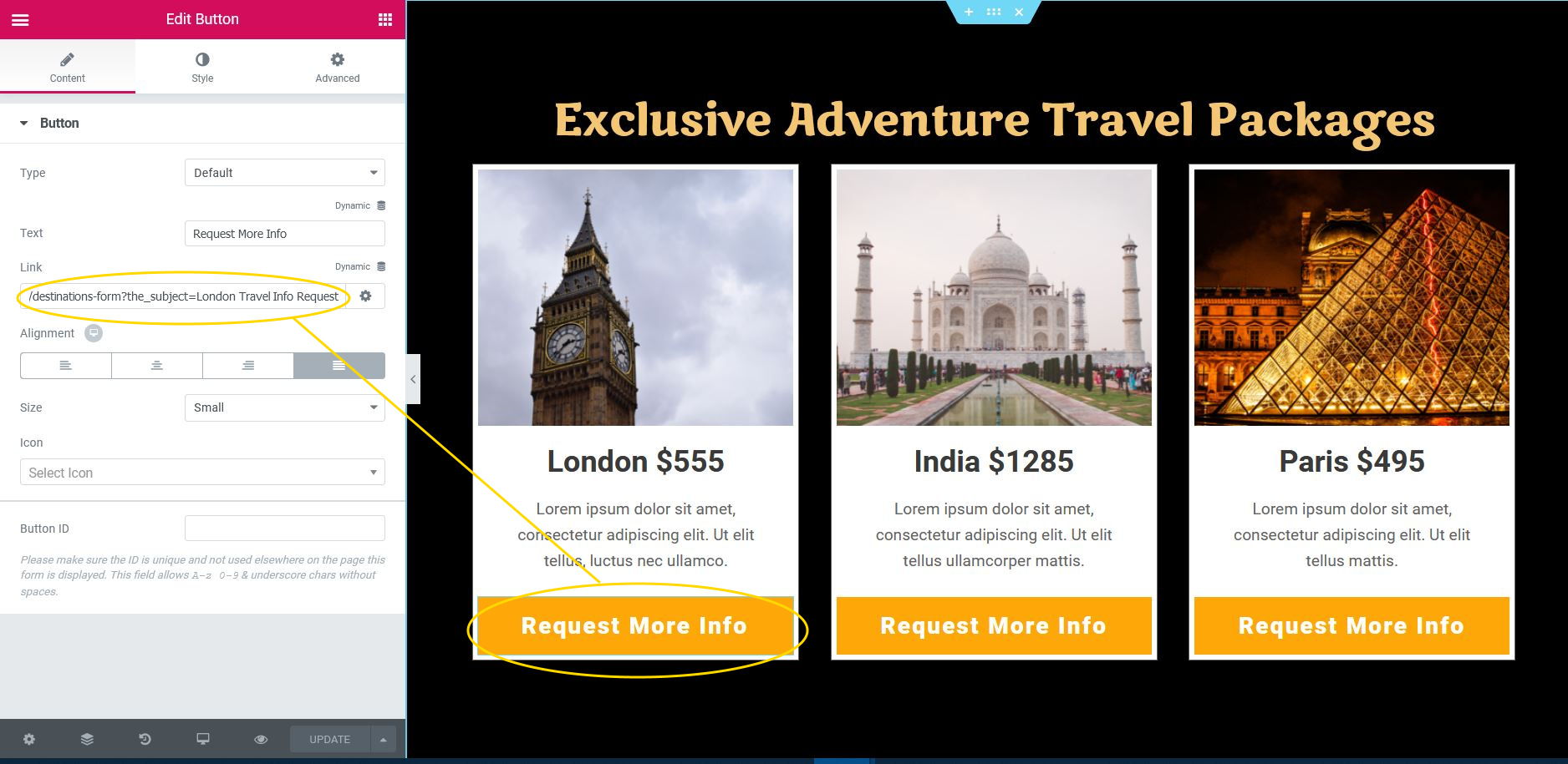 4. Use custom parameter as desired (e.g. Add custom parameter to button’s link)