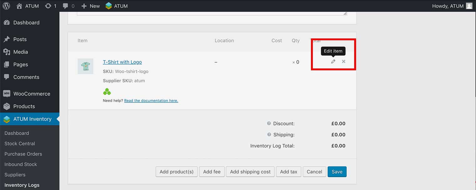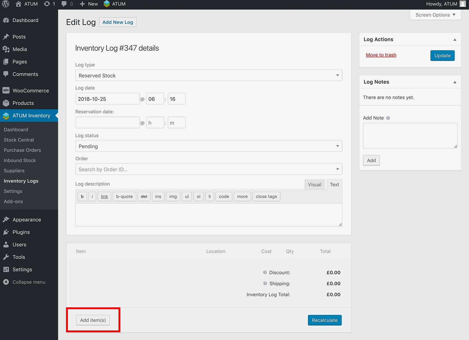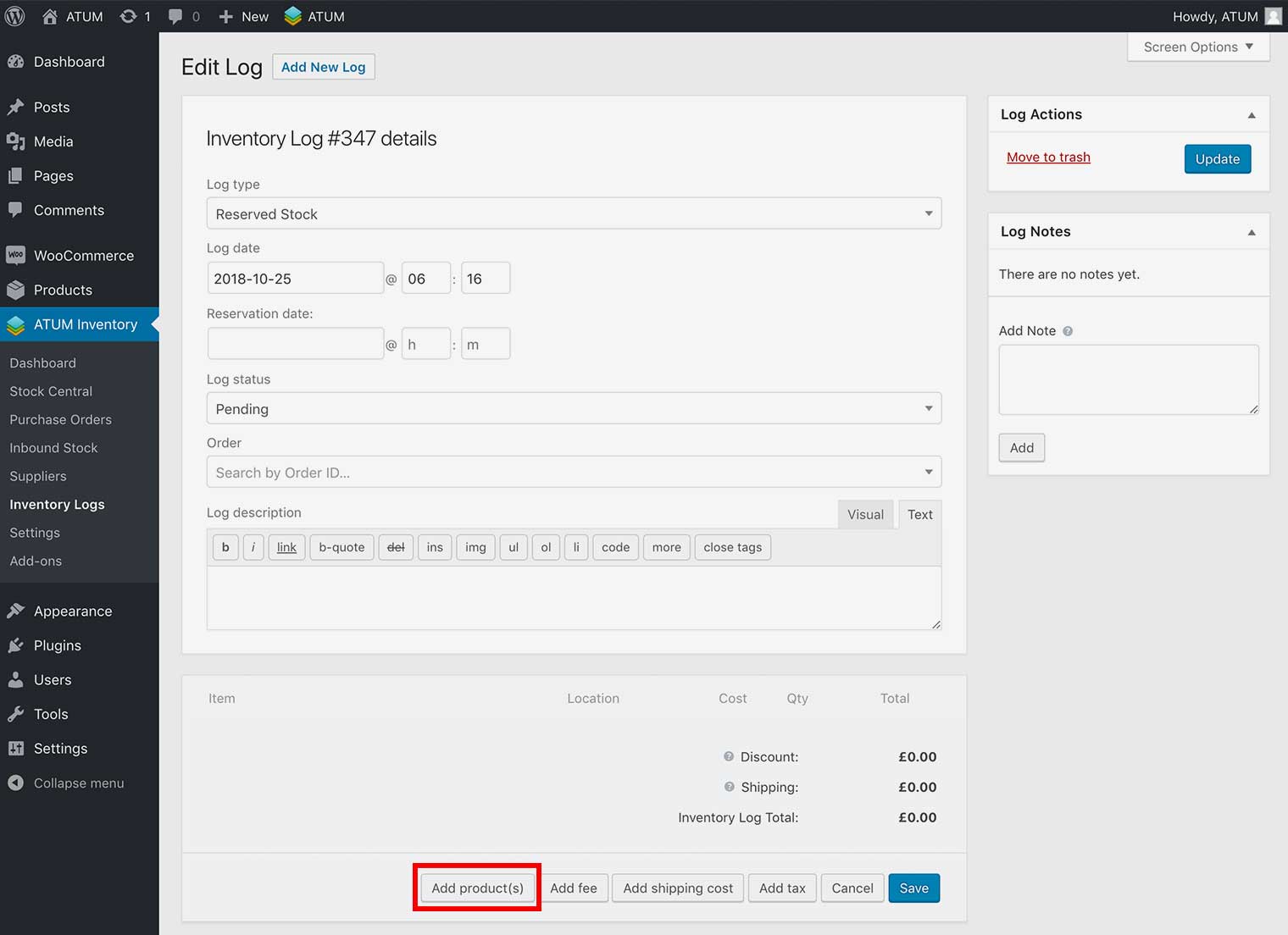 - In WordPress admin panel, go to ATUM Inventory > Inventory Logs and open a log for editing or create a new one.