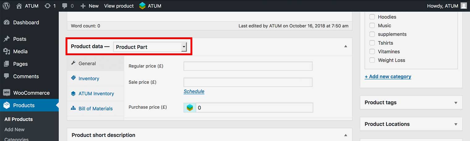 - In Product Data section select the Product Part option from the drop-down menu.
