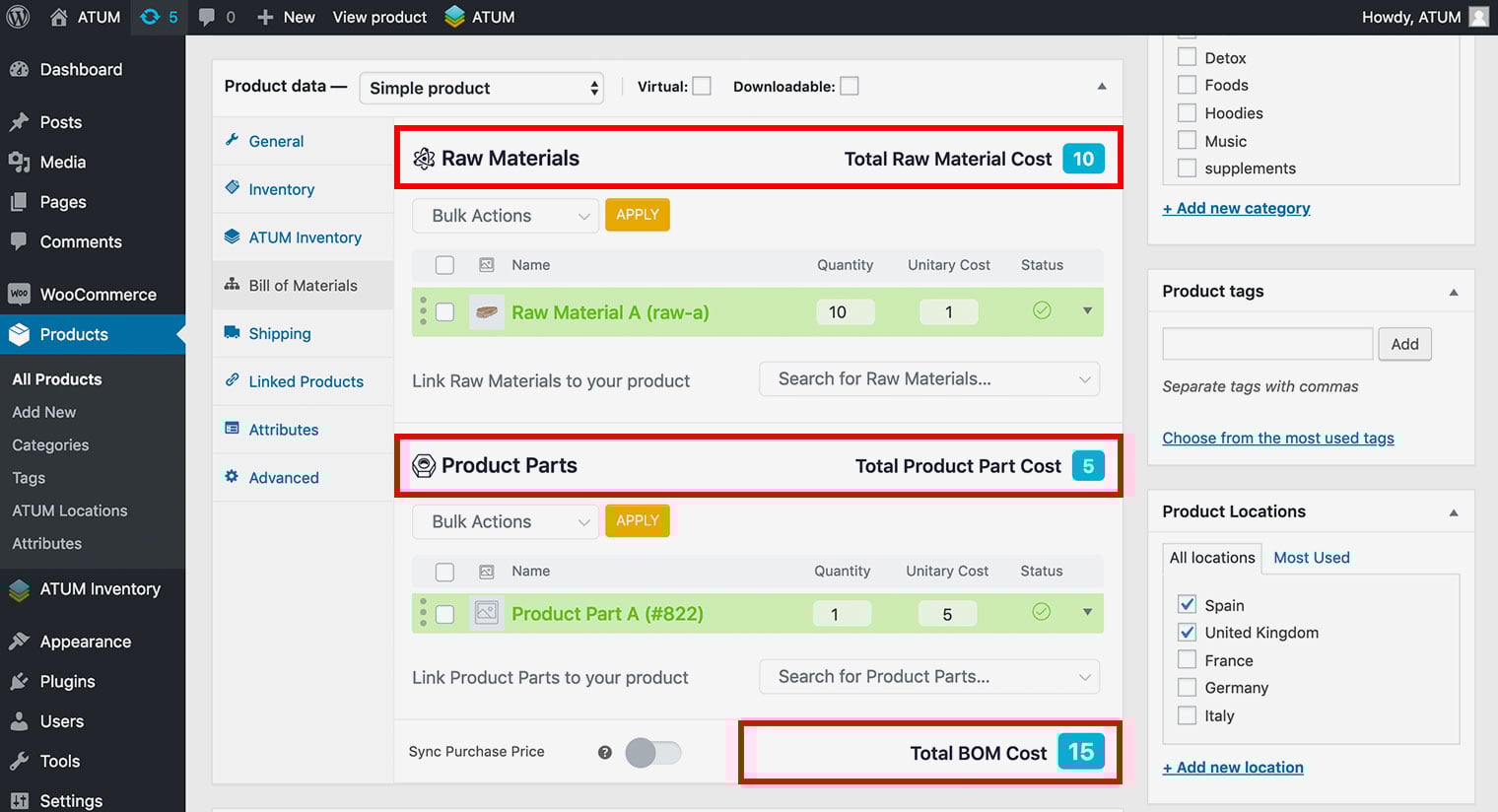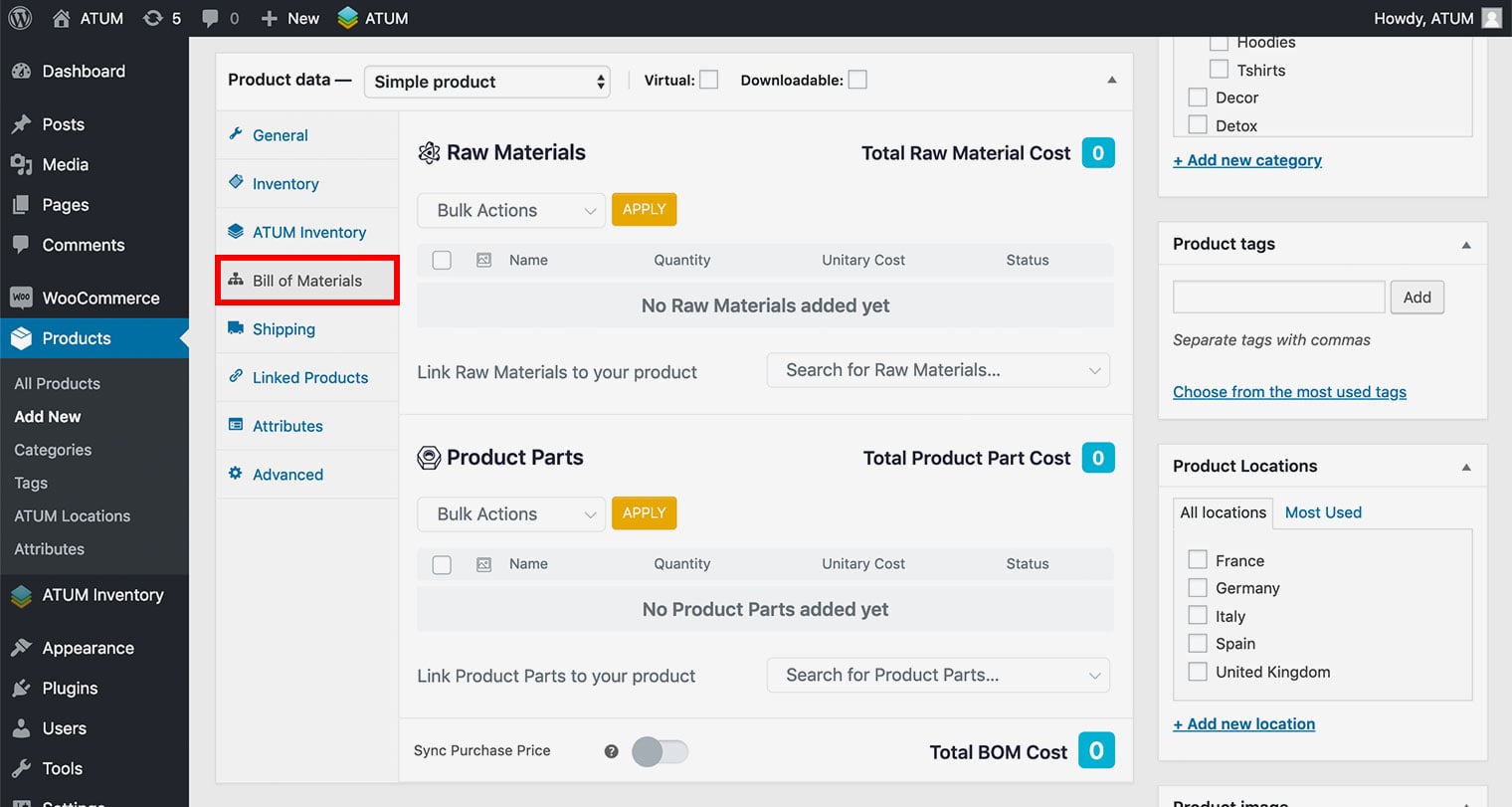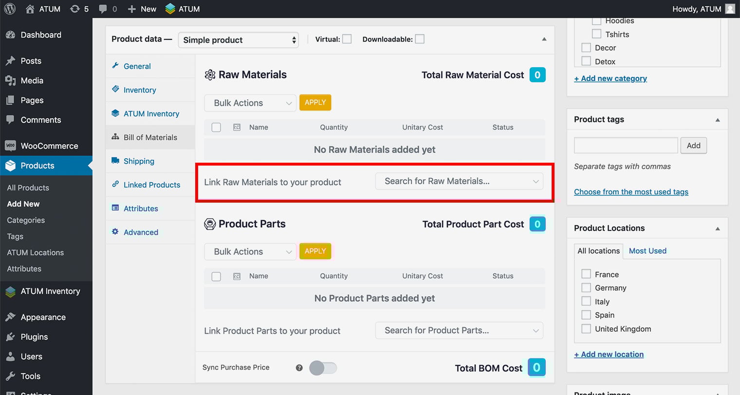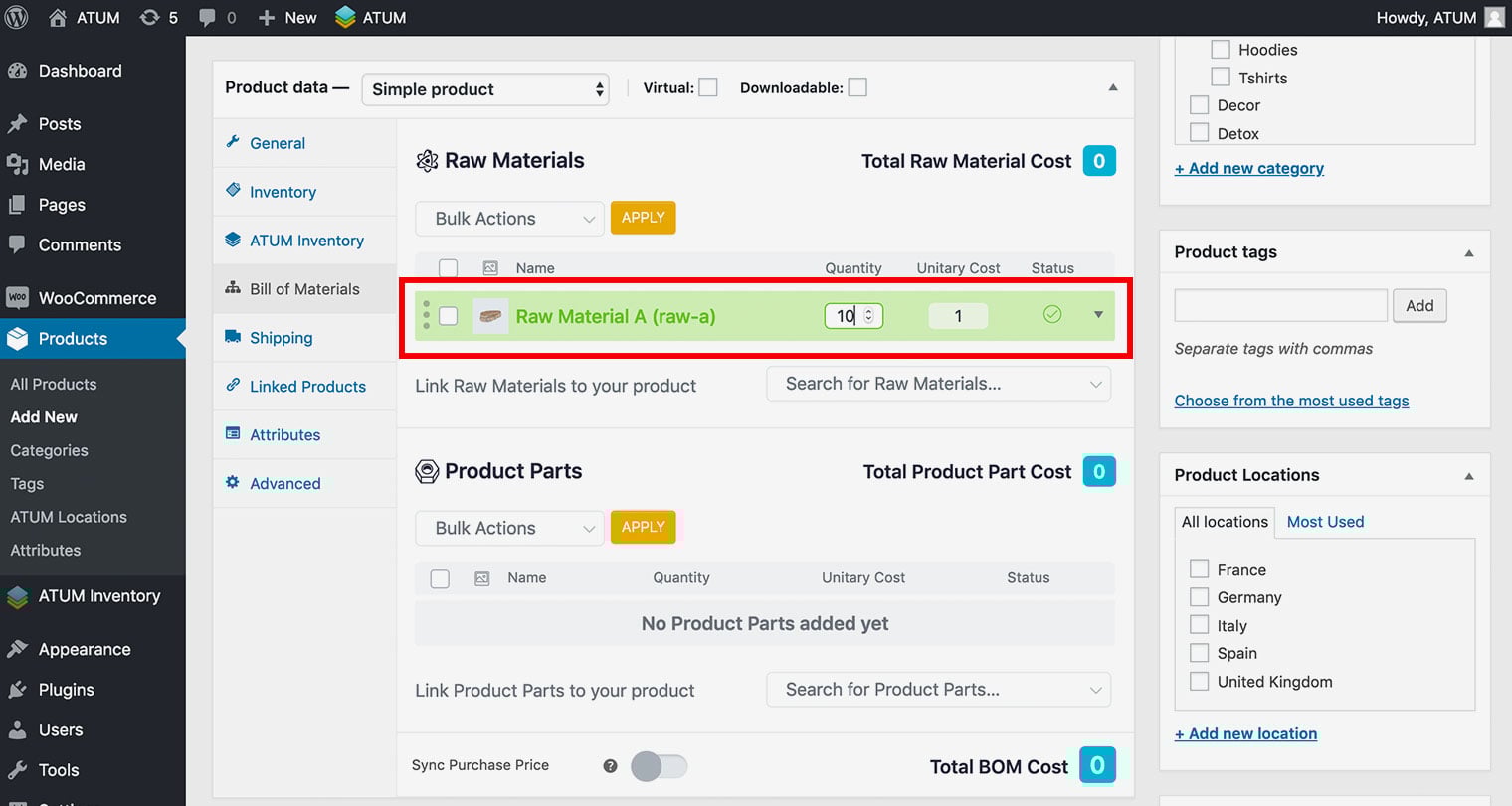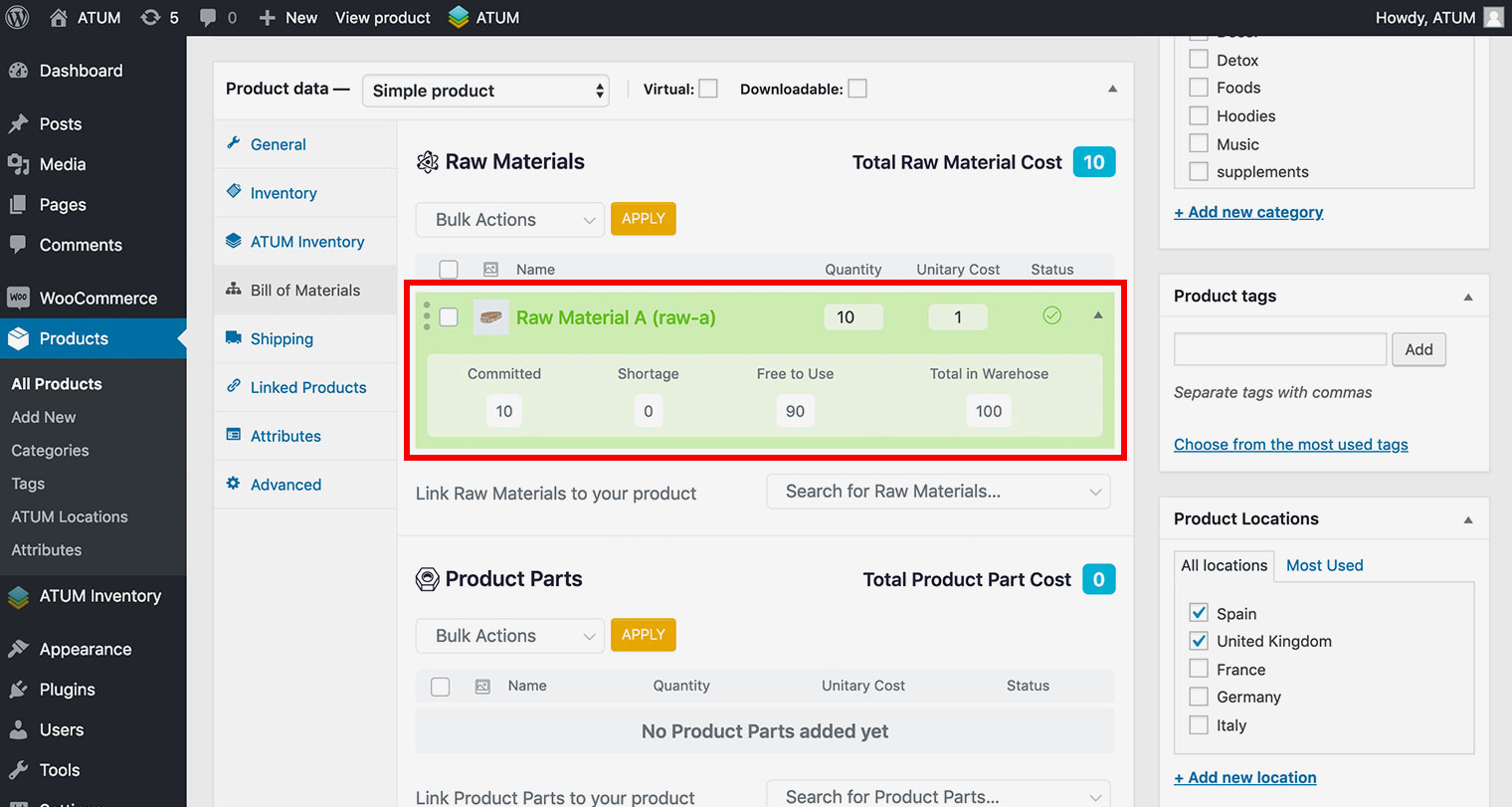 After a successful setup of Product Parts or Raw Materials product types ATUM allows you to create a connection between WC products and BOM.