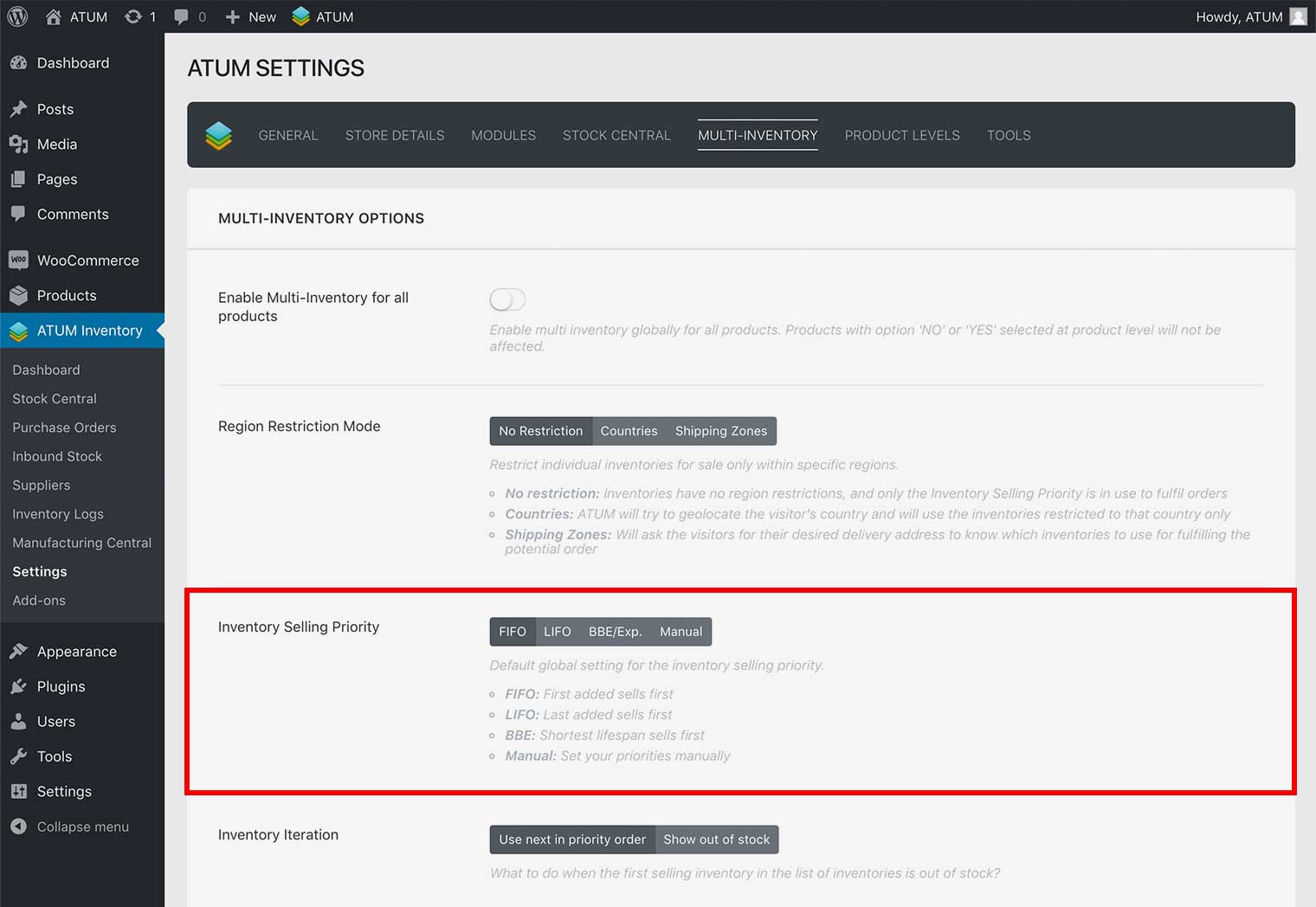ATUM Multi-Inventory premium add-on lets you add different selling priorities to inventories within a product. You have the option to set a different selling priority to each individual product or to set a global selling priority from the Multi-Inventory menu within the ATUM Settings page.