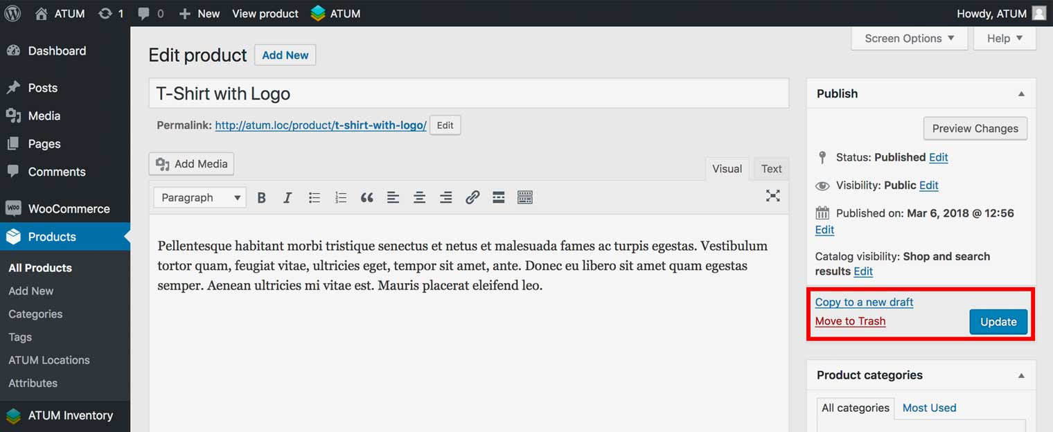 - Navigate down the Product page to the Product data section and select the tab called ATUM Inventory.