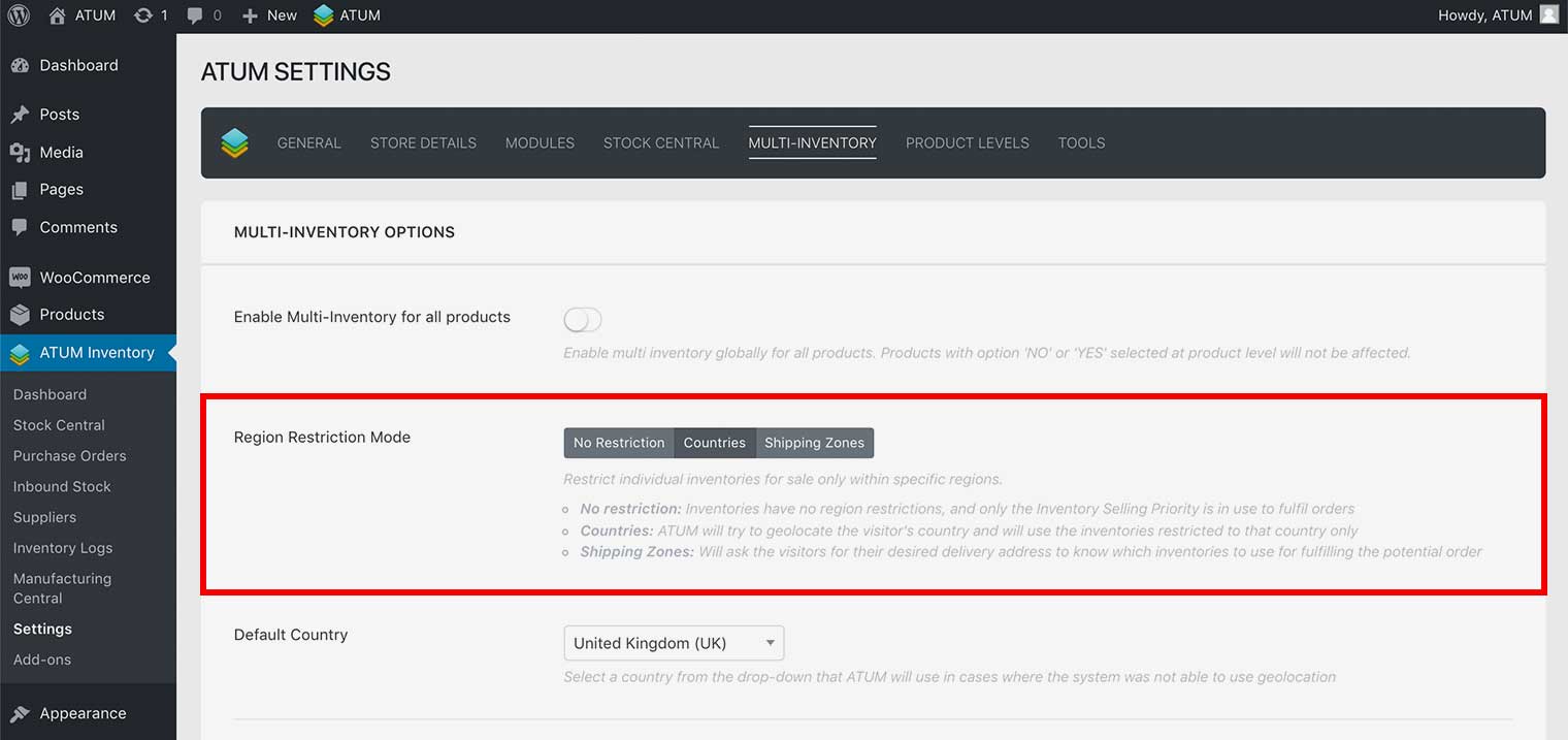 The Countries Restriction Mode allows you to sell inventories in specific countries only. The Multi-Inventory add-on will try to check if the user is logged in and has delivery destination saved in their profile and If this fails the add-on will try to geolocate the visitor’s country to detect the delivery destination. In the case any of this is not possible, the system will use the default country from ATUM’s settings.