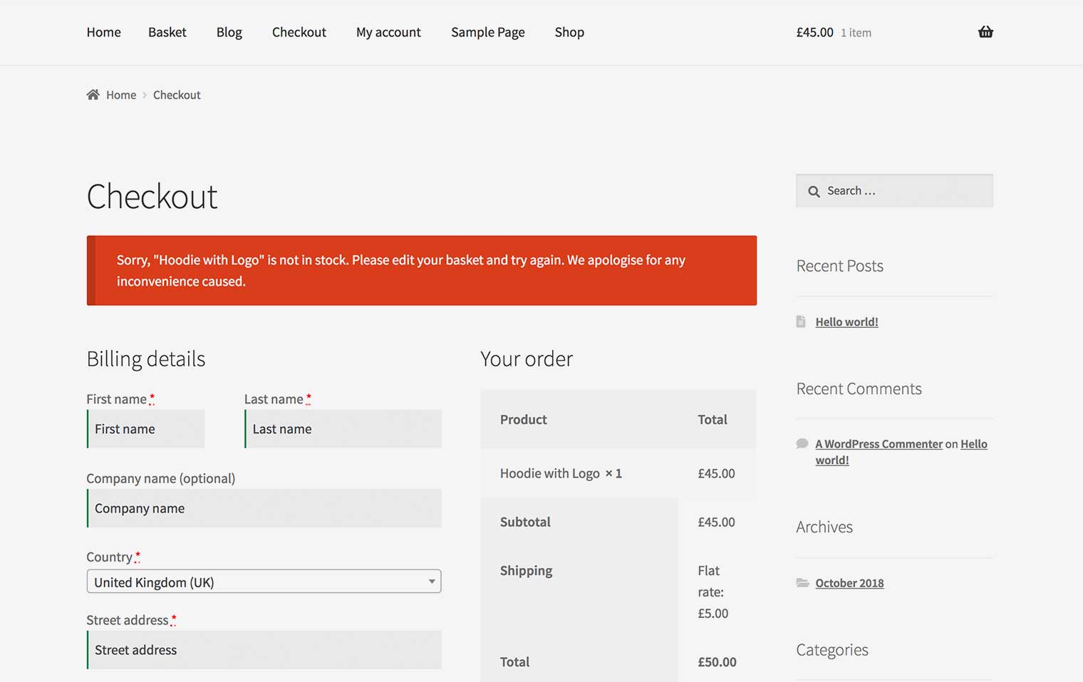 Example: Customer wants to buy a product that has inventory restricted to Spain. The customer is in Spain and gets geolocated there too and ads the product to cart. Within the checkout page, the customer changes the shipping destination to the United Kingdom. WooCommerce will use the default message telling the customer that the product is not available