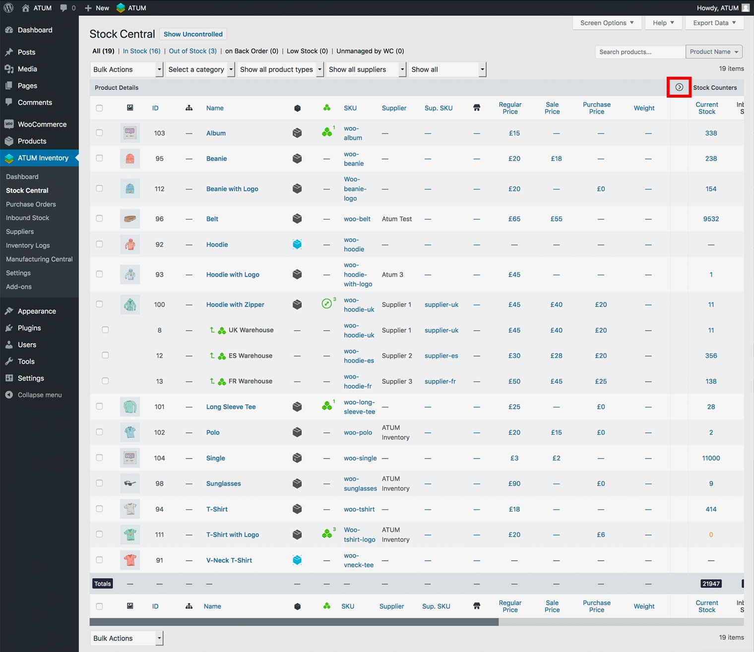 ATUM hides the multi-inventory data columns by default. If you would like to see the data, click the right-pointing arrow located in the table header to expand the columns.