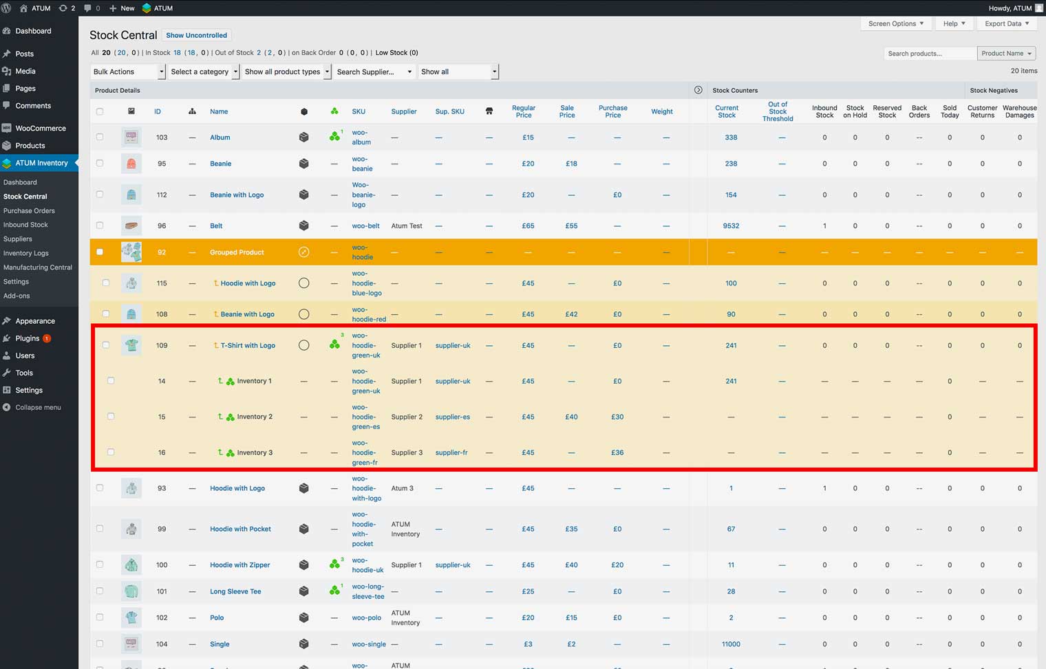To keep Stock Central nice and tidy we hide all the extra information behind an expandable feature. To reveal the multi-inventory info in simple products, click the green icon. For variable and grouped products click their relevant product type icons to expand their sub products and then the green multi-inventory icon.
