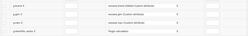 WooCommerce “out-of-the-box” doesn’t have any of the above product attributes available therefore you would either have to create those for yourself or upgrade to the Elite version of our plugin which makes all these attributes (and more) available to you on your product edit pages. Once you have filled in all the unique identifier fields for your products you need to make sure you put in the proper field mappings when configuring your product feed.