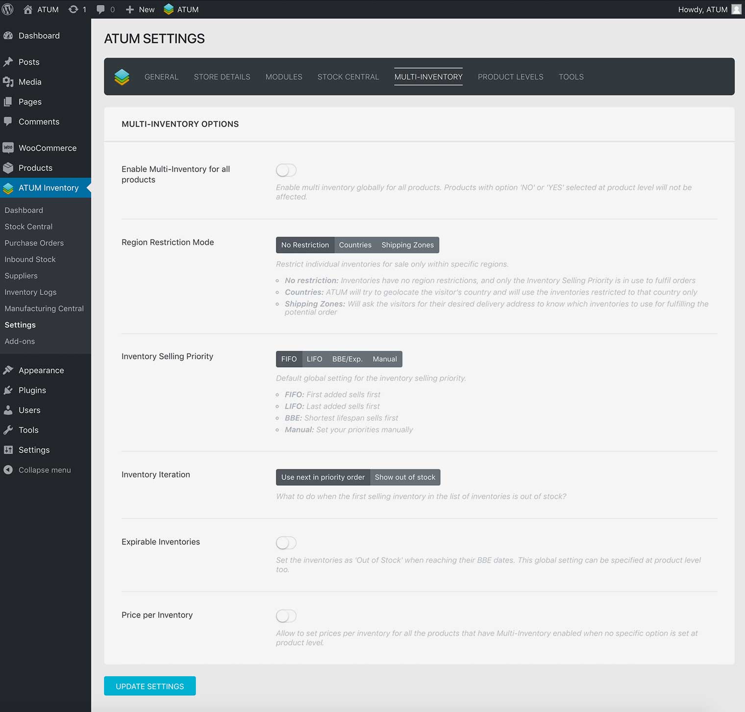 To access the ATUM Multi-Inventory settings navigate to your WordPress Dashboard, ATUM Inventory > Settings > MULTI-INVENTORY.