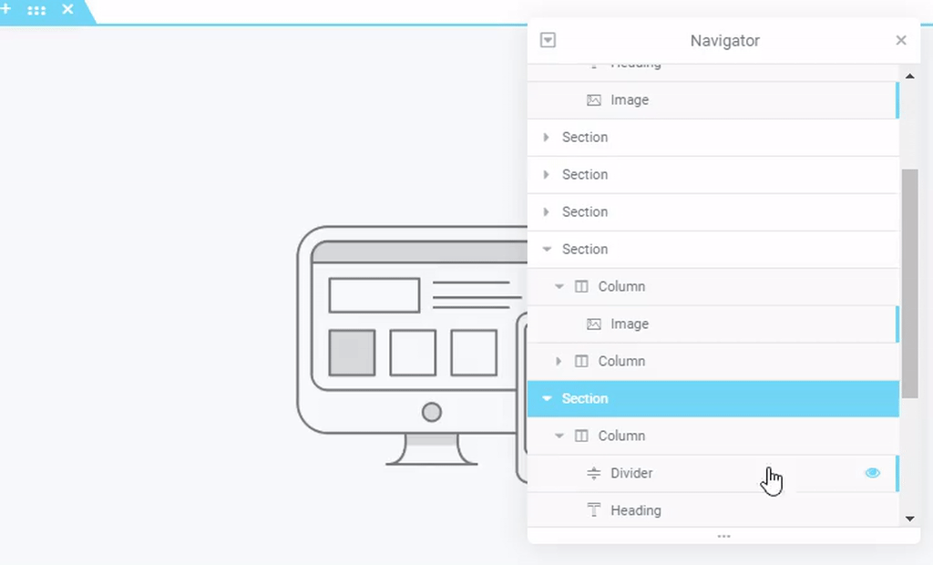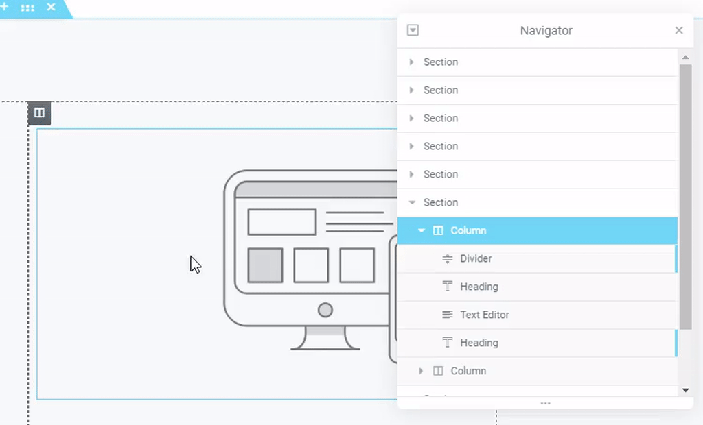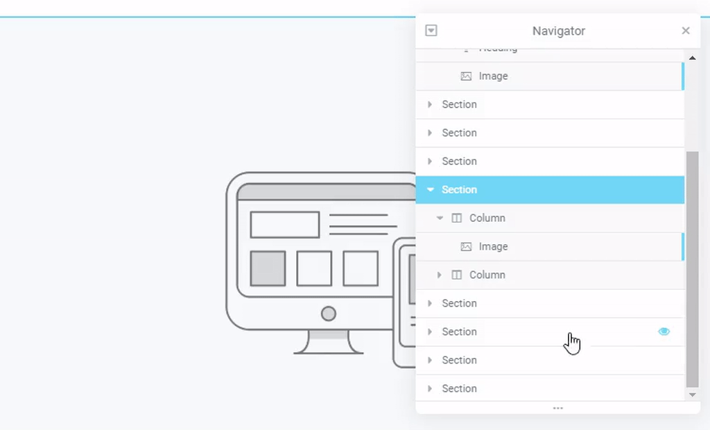 Indicates that this element is currently being viewed. Clicking the Eye will toggle between Show and Hide states for that element. Hiding the element will only affect the view on the back end, within the Elementor Editor. It will have no effect on the front end of the site.