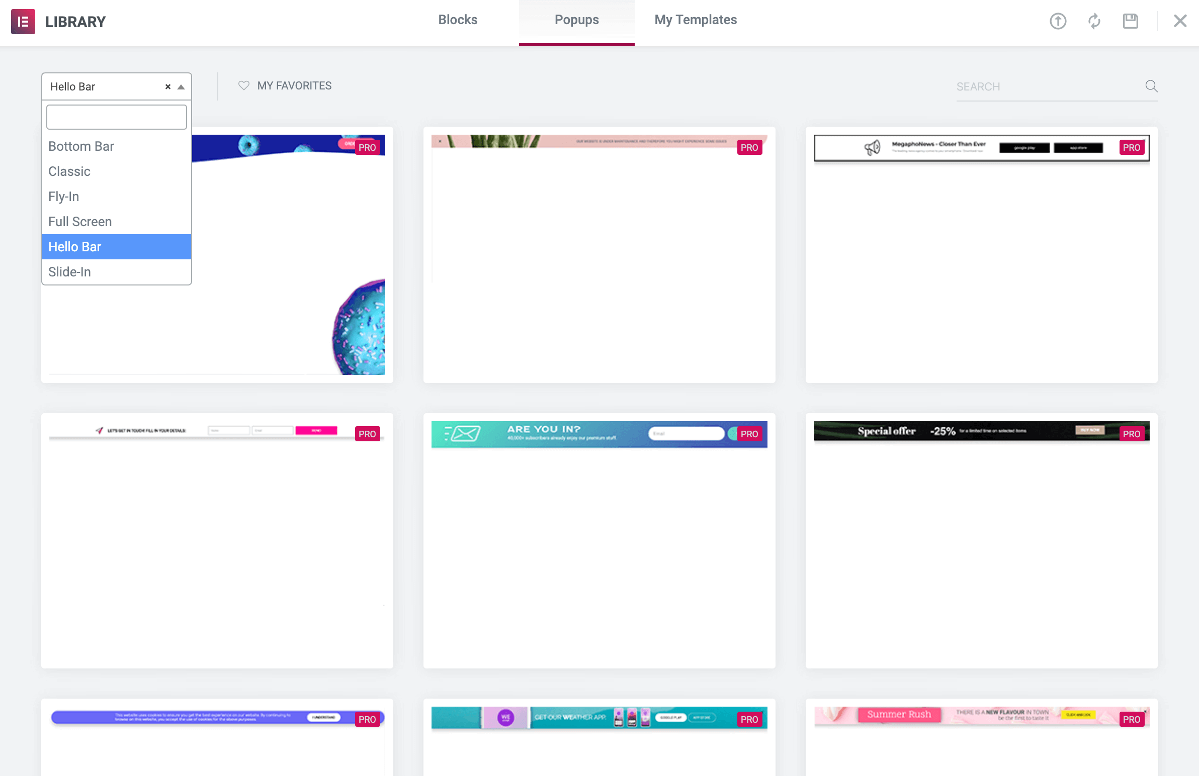 - In the Library, open the category dropdown to choose a Hello Bar, or create your own design
