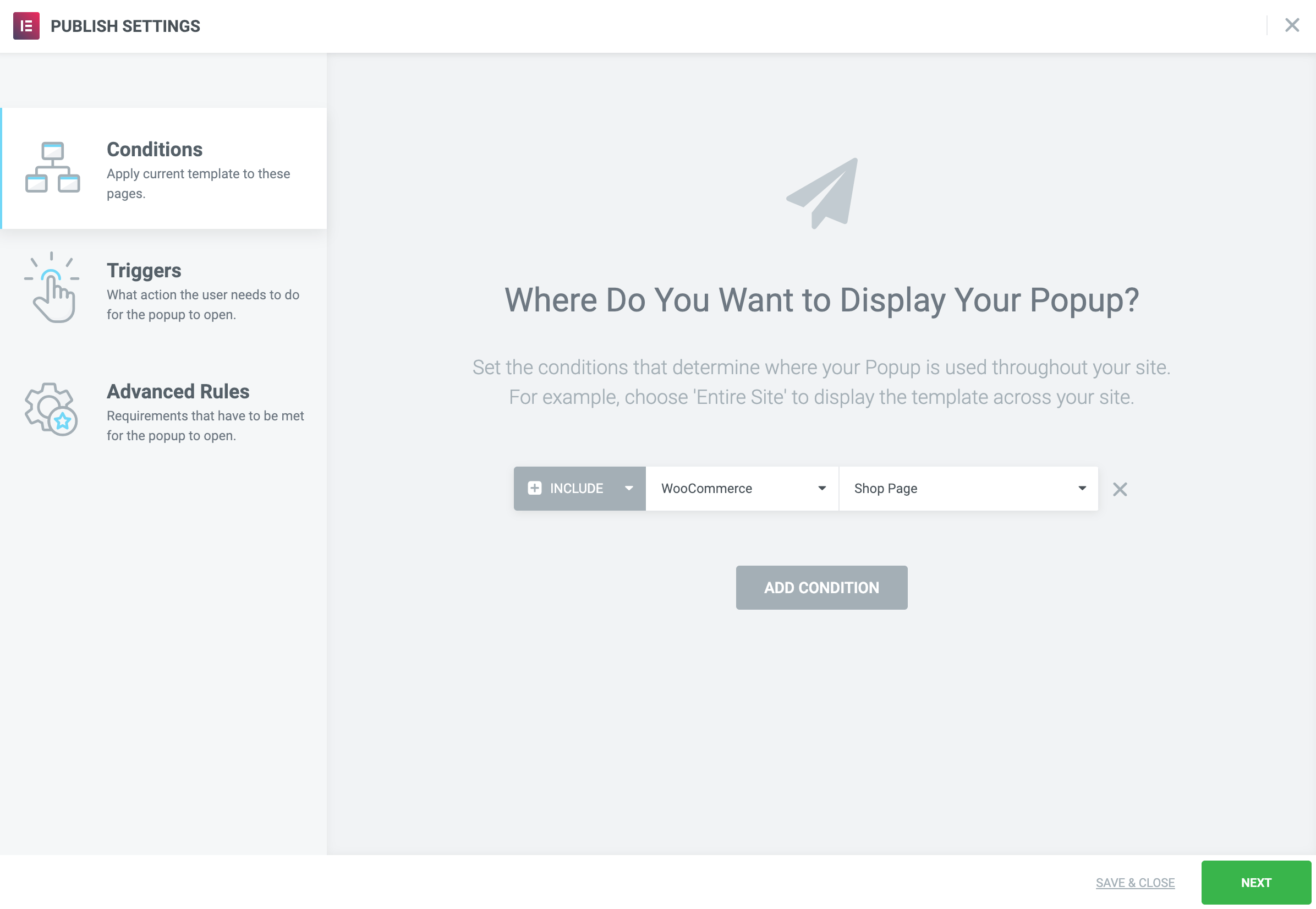 Conditions: Include: WooCommerce > Shop Page