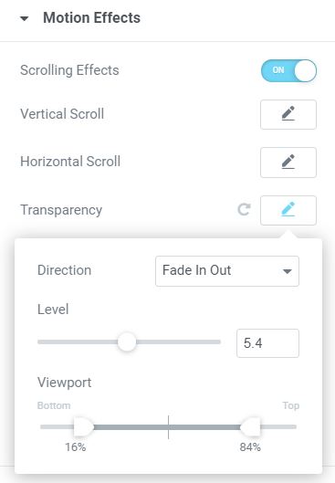 Transparency lets you gradually make elements more transparent or more visible in correlation to the visitor’s scroll. An example is having a title appear and then dissolve in accordance with the scroll.