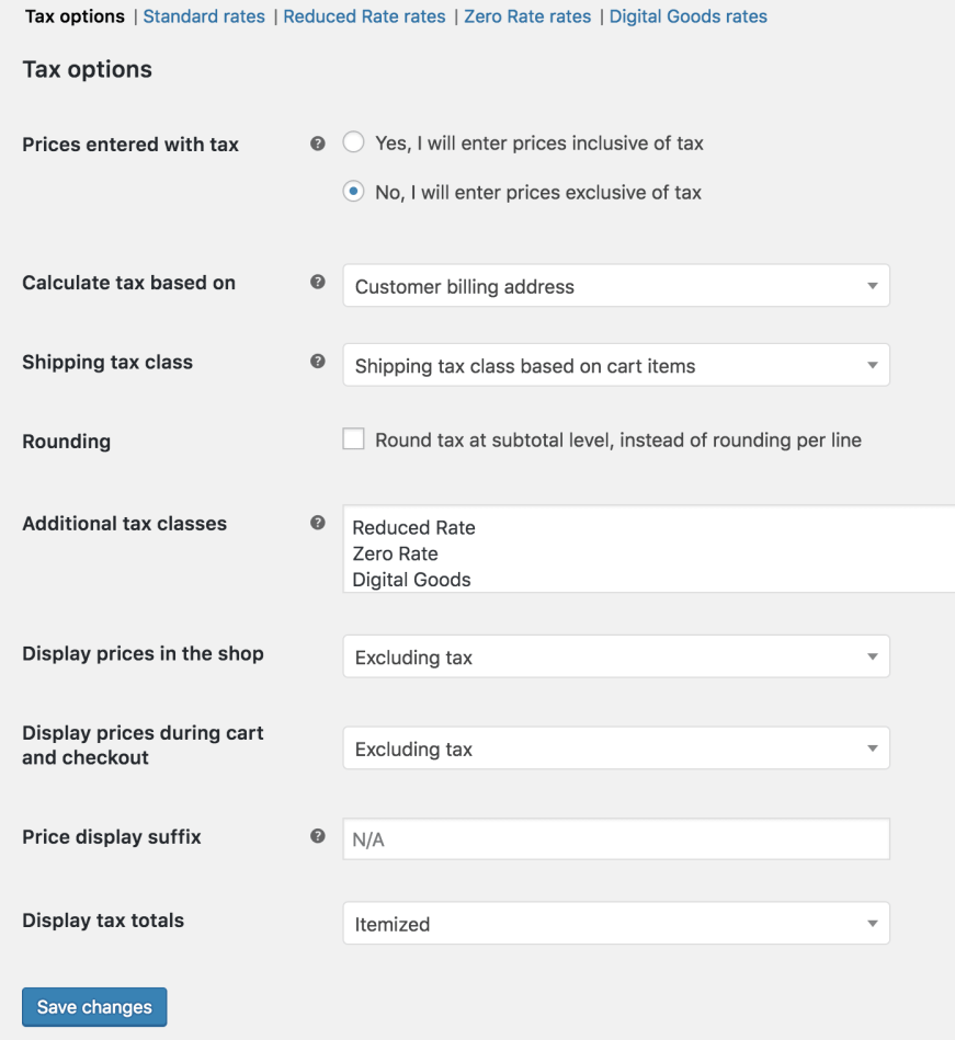 Alternatively, if you have a CSV file in the correct format, you can import the VAT rates to save time. Here are the above rates in CSV format with tax class Digital Goodstax_rates.csv