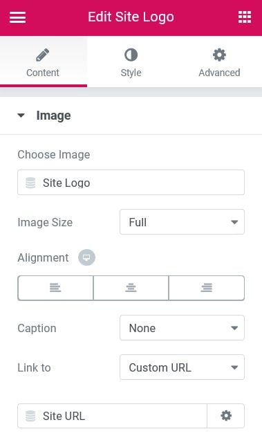 - Link to: Set the logo’s link, selecting from None, Media File or Custom Link. If Media File is chosen, set the Lightbox to Default, Yes, or No. If Custom Link is chosen, the URL will be automatically, dynamically retrieved for you.