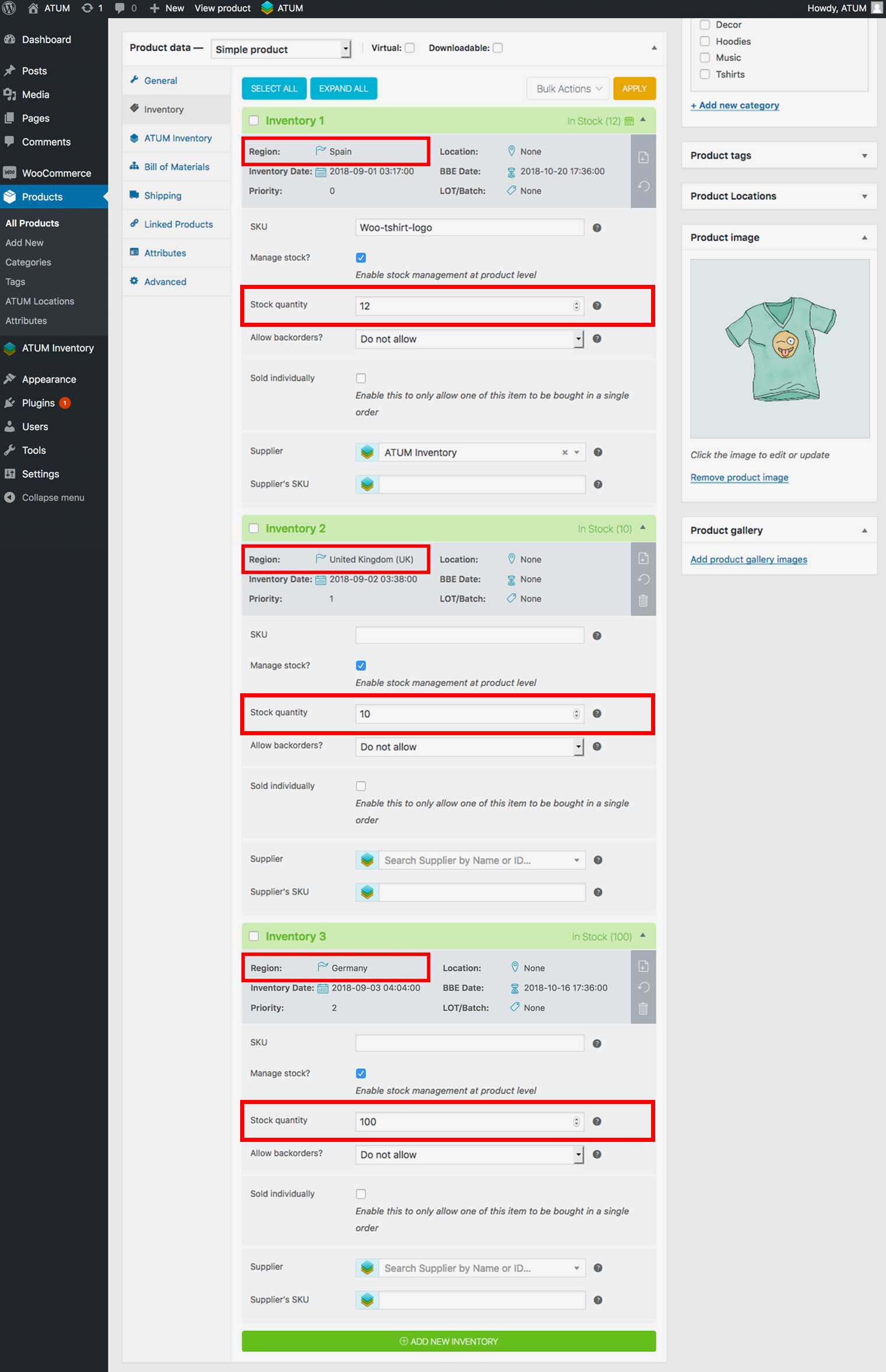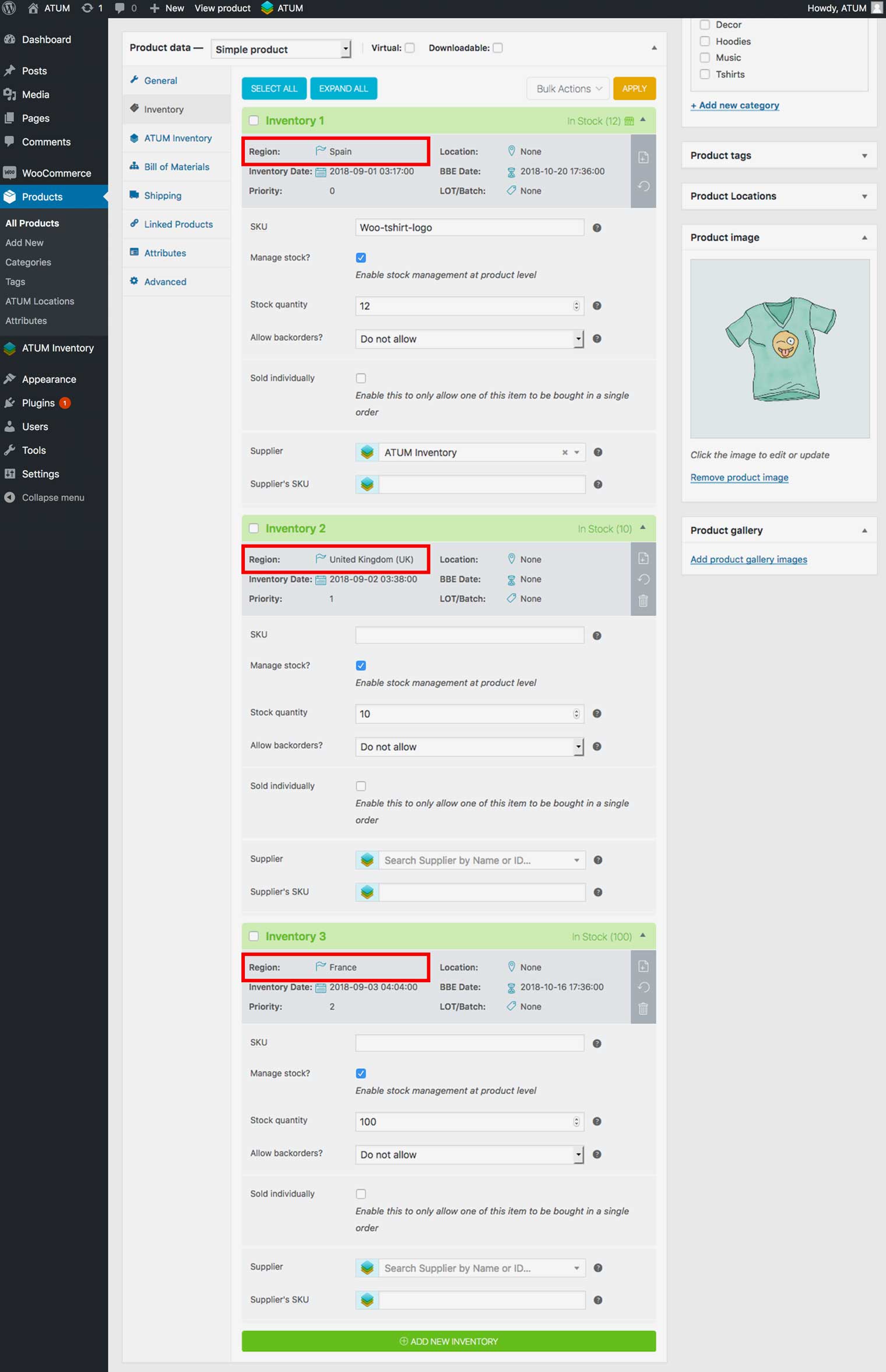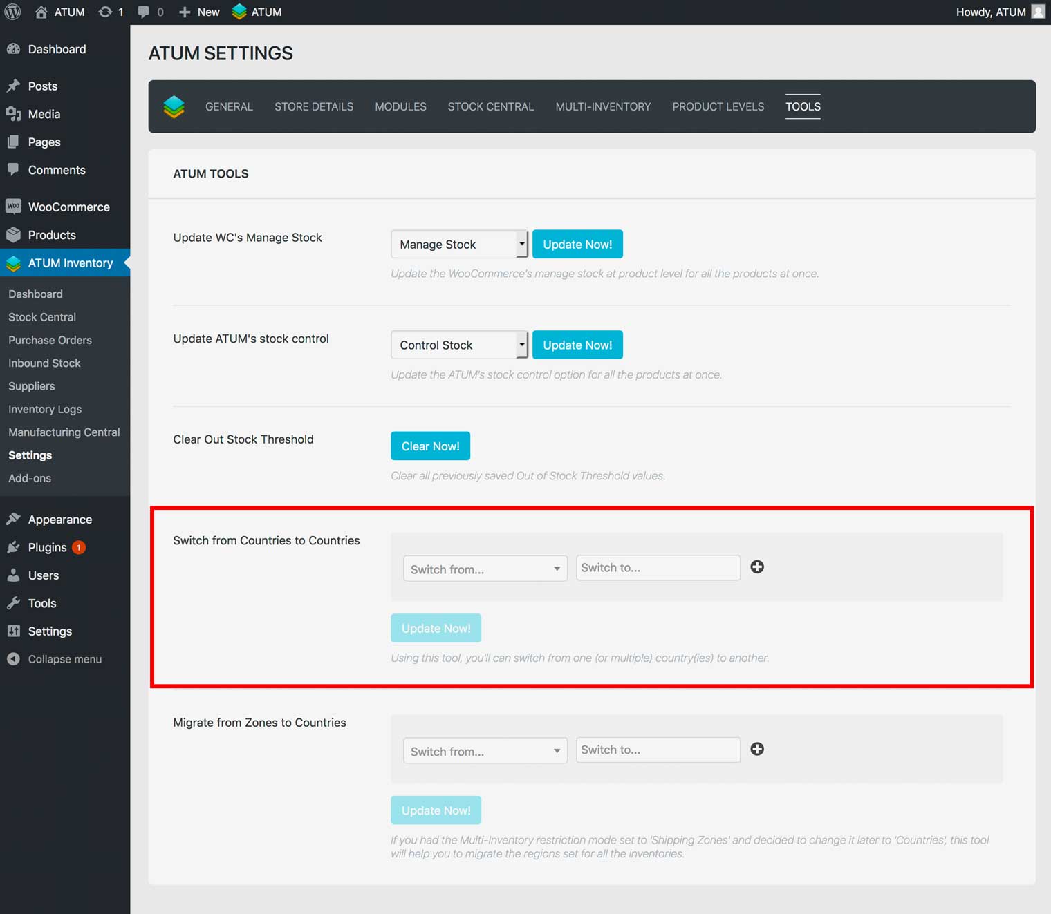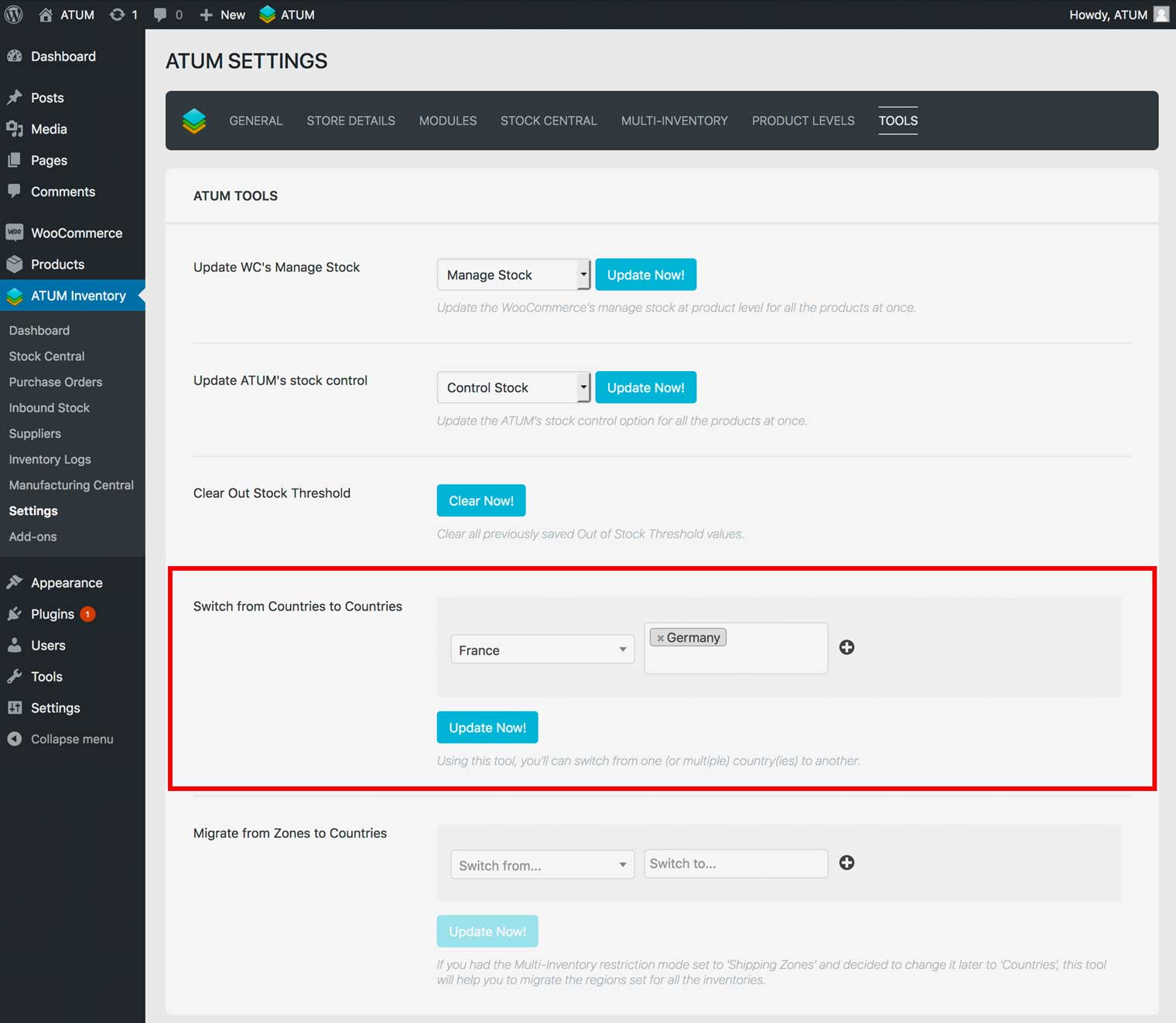 If you are using Countries Restriction Mode and need to switch the country of the inventories, ATUM Multi-Inventory allows you to do bulk action the change to make your life easier.