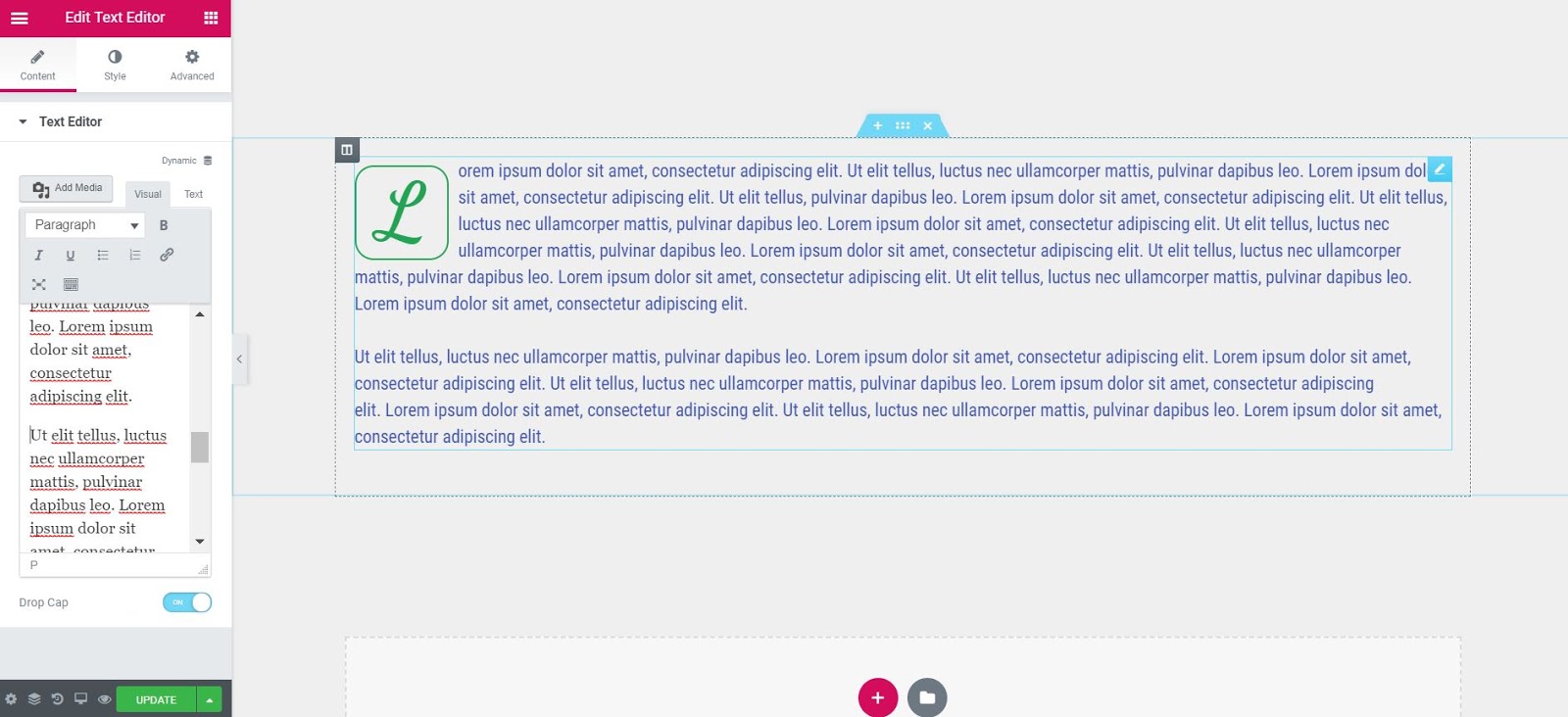Drop Cap: Slide to ON to set the first letter of the text as a Drop Cap, which makes it larger and gives it the ability to be styled independently from the rest of the text.