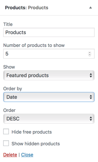 With the Products widget, you can display your products ordered by date, price, sales or randomly. Additionally, you can display products from all of your products, only featured products or only products on sale.